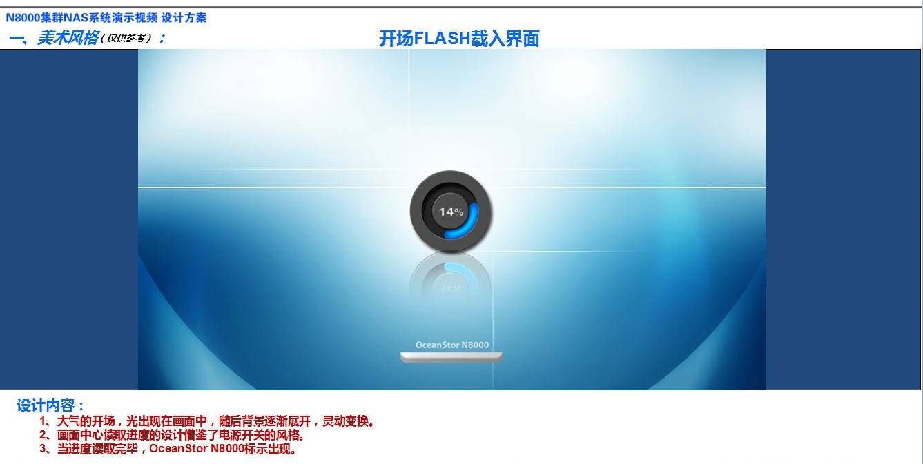 1、大氣的開場,光出現在畫面中,隨后背景逐漸展開,靈動變換。 2、畫面中心讀取進度的設計借鑒了電源開關的風格。 3、當進度讀取完畢,OceanStor N8000標示出現。