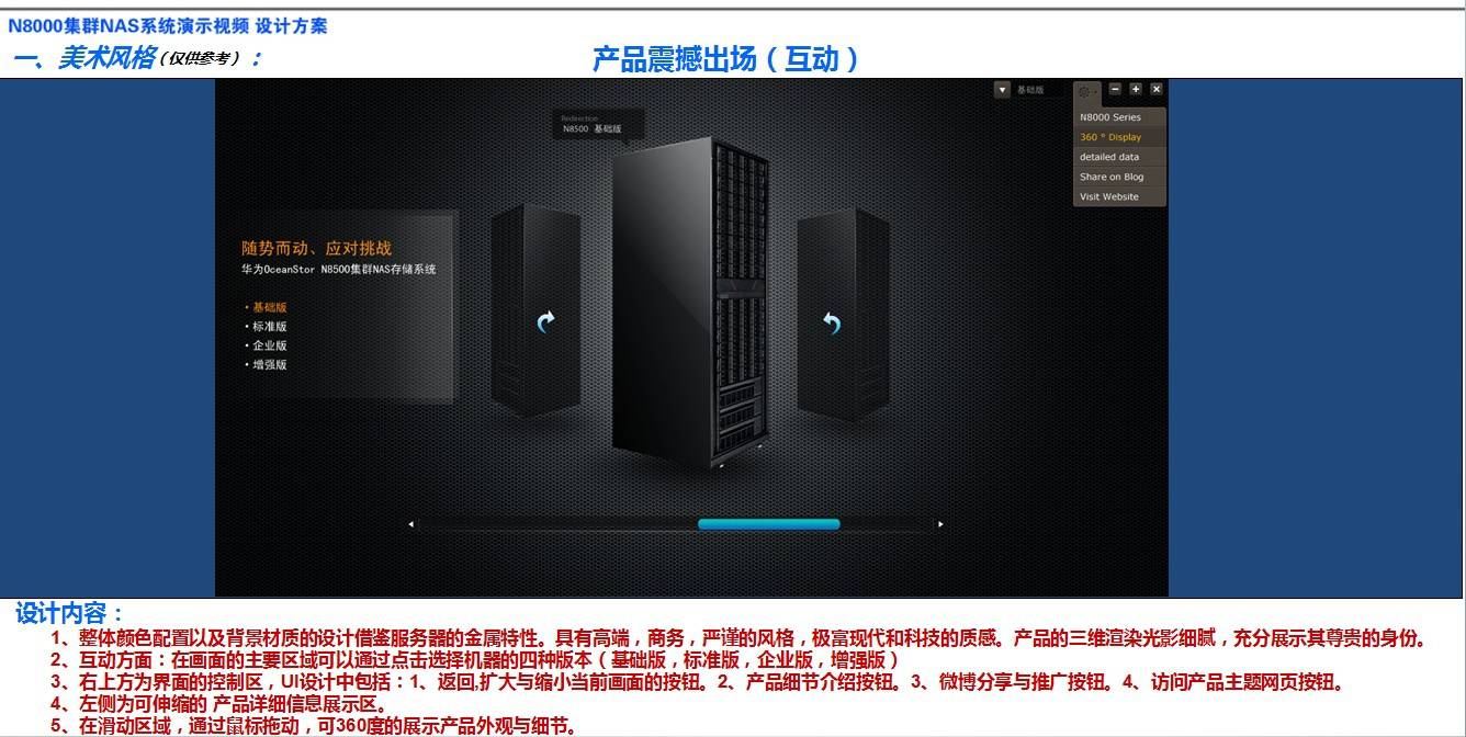 1、整體顏色配置以及背景材質的設計借鑒服務器的金屬特性。具有高端,商務,嚴謹的風格,極富現代和科技的質感。產品的三維渲染光影細膩,充分展示其尊貴的身份。 2、互動方面:在畫面的主要區域可以通過點擊選擇機器的四種版本(基礎版,標準版,企業版,增強版) 3、右上方為界面的控制區,UI設計中包括:1、返回,擴大與縮小當前畫面的按鈕。2、產品細節介紹按鈕。3、微博分享與推廣按鈕。4、訪問產品主題網頁按鈕。 4、左側為可伸縮的 產品詳細信息展示區。 5、在滑動區域,通過鼠標拖動,可360度的展示產品外觀與細節。