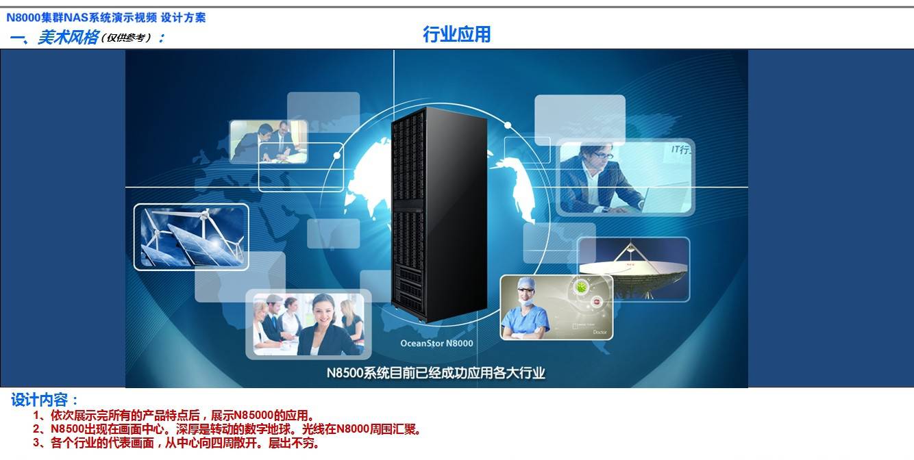 1、依次展示完所有的產品特點后,展示N85000的應用。 2、N8500出現在畫面中心。深厚是轉動的數字地球。光線在N8000周圍匯聚。 3、各個行業的代表畫面,從中心向四周散開。層出不窮。