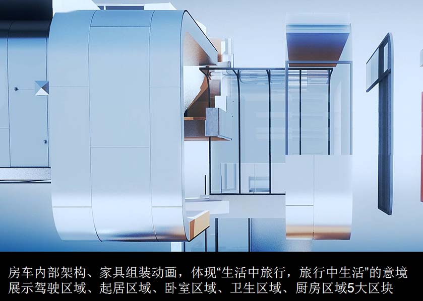 房車內部架構、家具組裝動畫,體現“生活中旅行,旅行中生活”的意境 展示駕駛區域、起居區域、臥室區域、衛生區域、廚房區域5大區塊