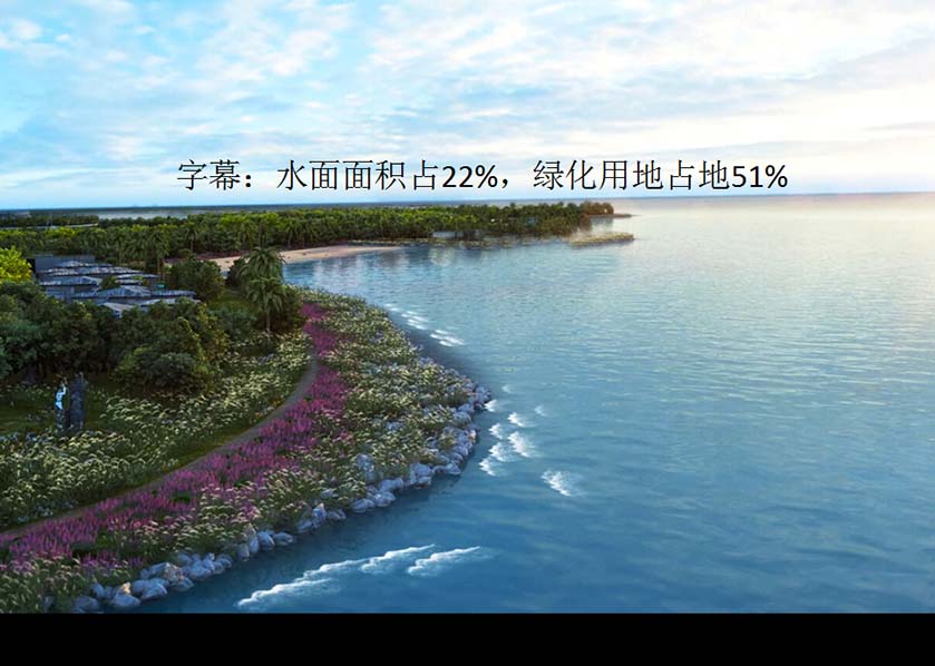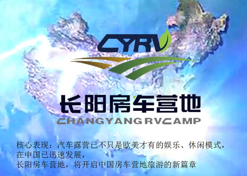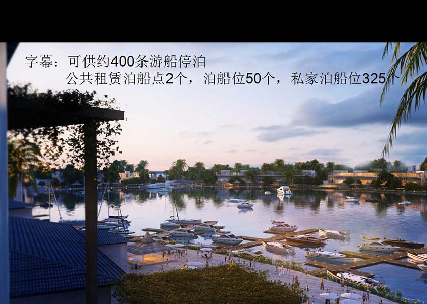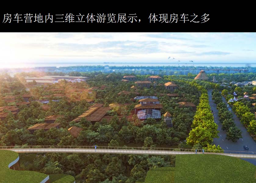 鏡頭推進,房車營地景觀、水系展示(水面上有游船在行駛)