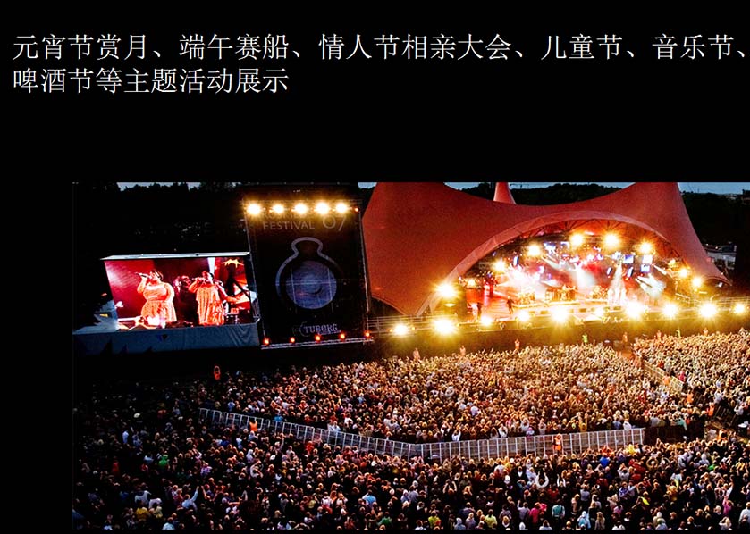 元宵節賞月、端午賽船、情人節相親大會、兒童節、音樂節、啤酒節等主題活動展示