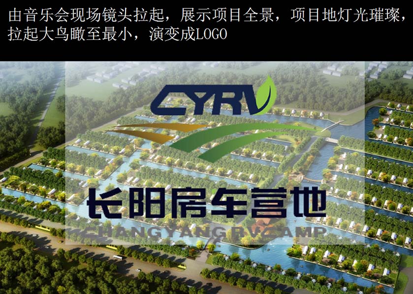 由音樂會現場鏡頭拉起,展示項目全景,項目地燈光璀璨,拉起大鳥瞰至最小,演變成LOGO