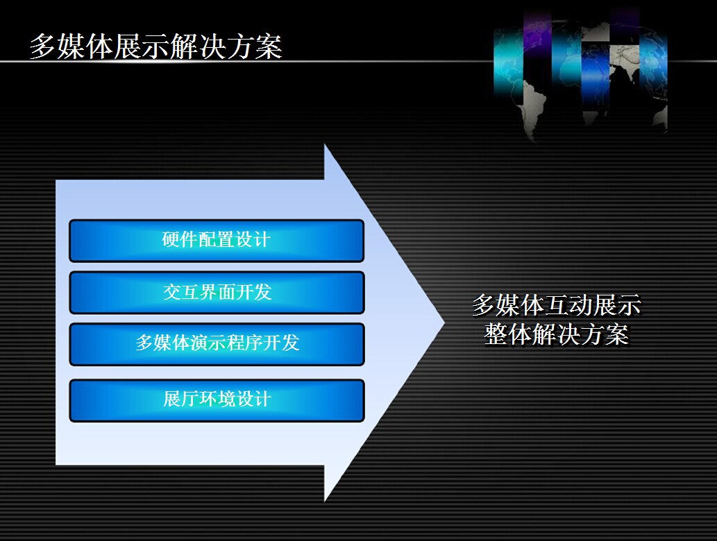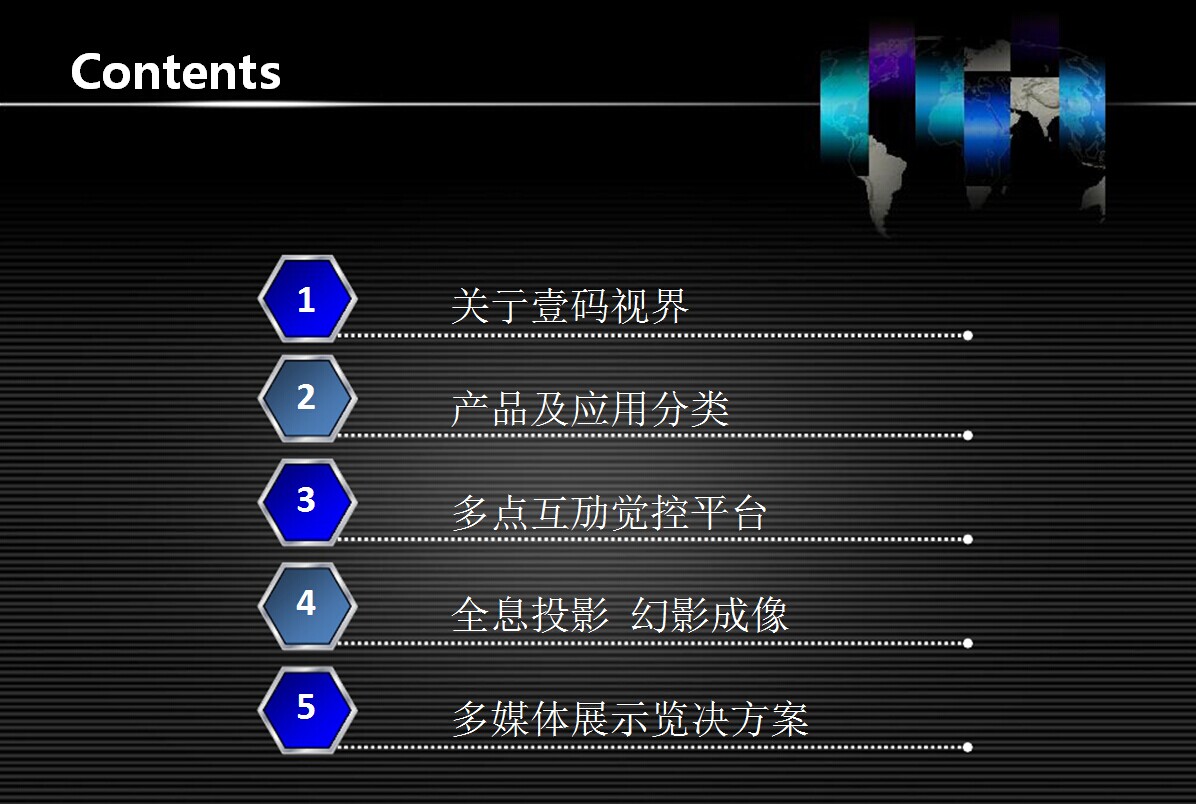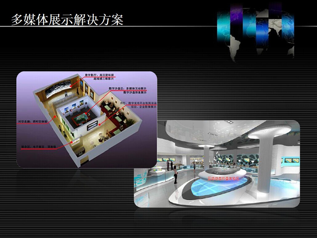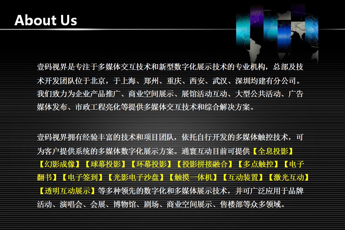 多媒體交互展示,多媒體覺控平臺通過各種內置的展示組件和展示效果 為觀看者帶來時尚華麗的展示體驗。當觀眾對所展現的內容感興趣時,即可通過簡單的手 勢選擇相關內容,如規頻、音頻、圖片、文字、圖表 等。