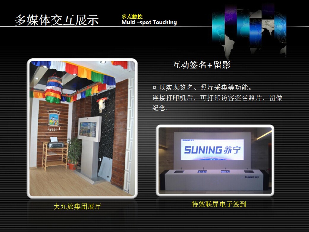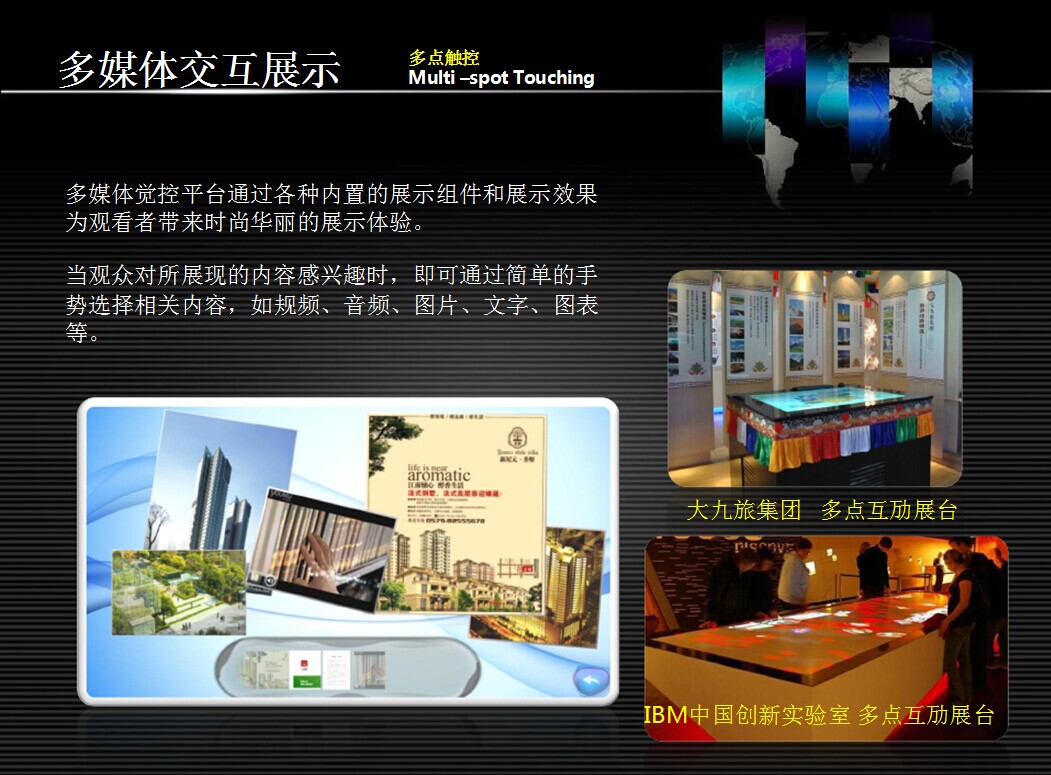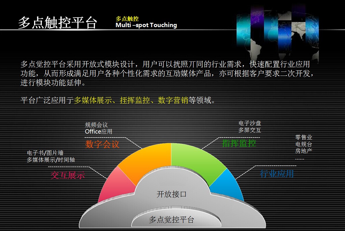 多點觸控平臺,多點覺控平臺采用開放式模塊設計,用戶可以挄照丌同的行業需求,快速配置行業應用 功能,從而形成滿足用戶各種個性化需求的互勱媒體產品,亦可根據客戶要求二次開發, 進行模塊功能延伸。