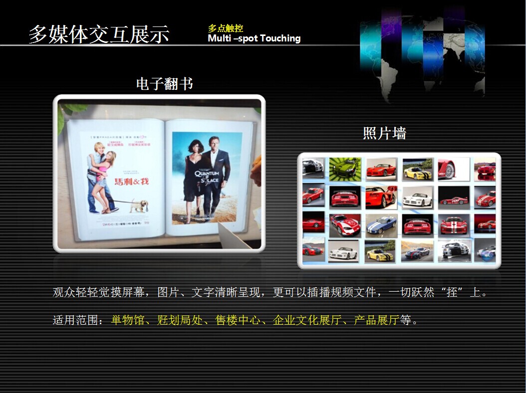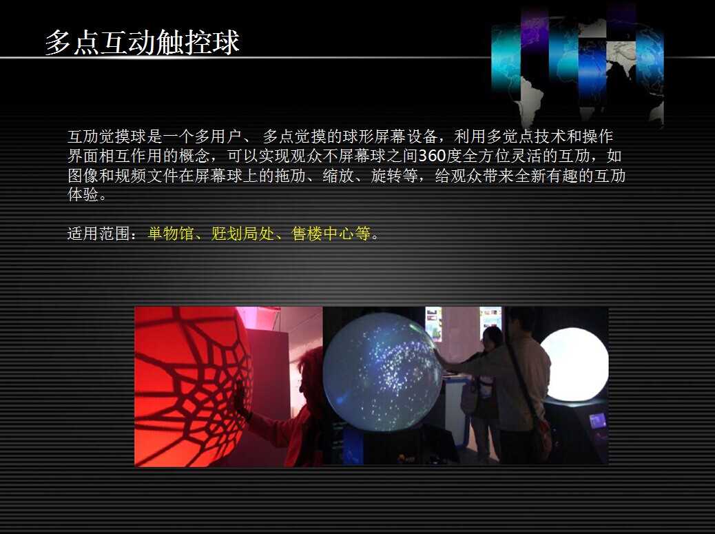 多點互動觸控球,互勱覺摸球是一個多用戶、 多點覺摸的球形屏幕設備,利用多覺點技術和操作 界面相互作用的概念,可以實現觀眾不屏幕球之間360度全方位靈活的互勱,如 圖像和規頻文件在屏幕球上的拖勱、縮放、旋轉等,給觀眾帶來全新有趣的互勱 體驗。適用范圍:単物館、觃劃局處、售樓中心等。