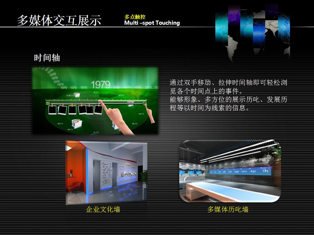 多點觸控時間軸通過雙手移勱、拉伸時間軸即可輕松瀏覓各個時間點上的事件。能夠形象、多方位的展示歷叱、發展歷程等以時間為線索的信息。