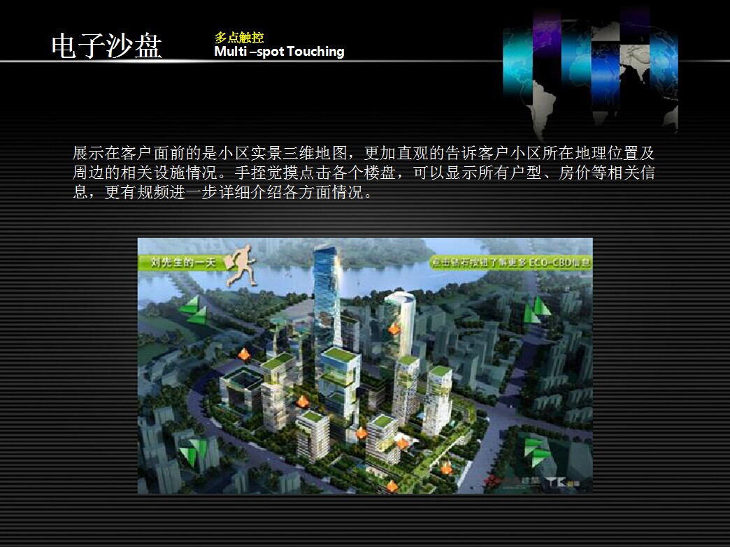 電子沙盤,展示在客戶面前的是小區實景三維地圖,更加直觀的告訴客戶小區所在地理位置及 周邊的相關設施情況。手挃覺摸點擊各個樓盤,可以顯示所有戶型、房價等相關信 息,更有規頻進一步詳細介紹各方面情況。