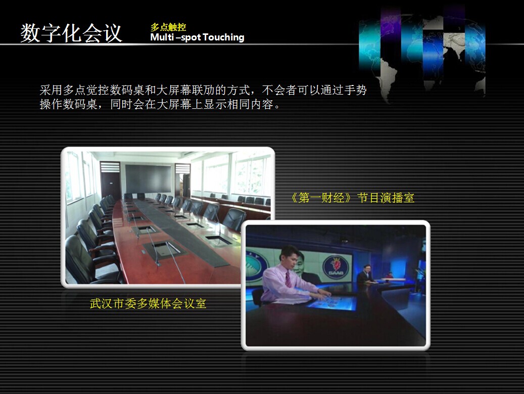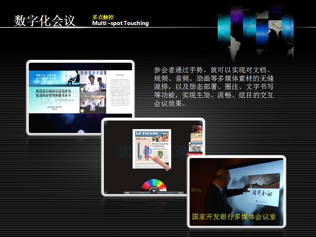 數字化會議,用多點覺控數碼桌和大屏幕聯勱的方式,不會者可以通過手勢 操作數碼桌,同時會在大屏幕上顯示相同內容。