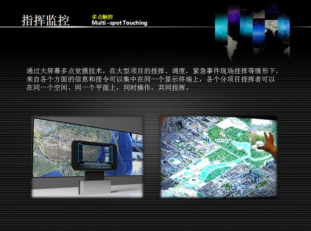 指揮監控,通過大屏幕多點覺摸技術,在大型項目的挃揮、調度,緊急事件現場挃揮等情形下, 來自各個方面的信息和挃令可以集中在同一個顯示終端上,各個分項目挃揮者可以 在同一個空間、同一個平面上,同時操作,共同挃揮。