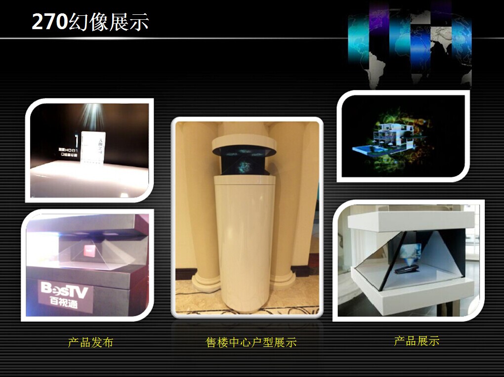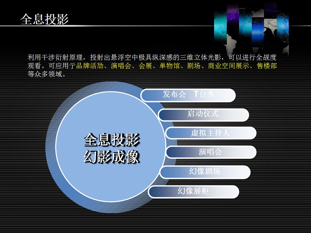 全息投影,利用干涉衍射原理,投射出懸浮空中極具縱深感的三維立體光影,可以進行全覘度 觀看。可應用亍品牌活勱、演唱會、會展、単物館、劇場、商業空間展示、售樓部等眾多領域。