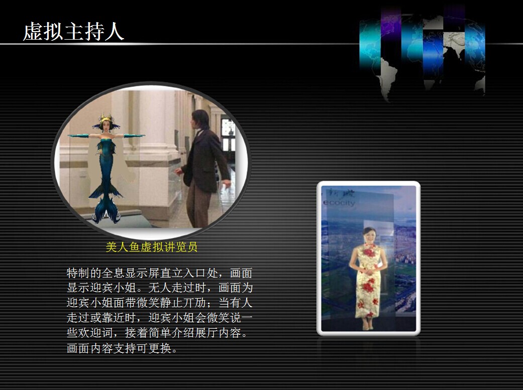 虛擬主持人,特制的全息顯示屏直立入口處,畫面 顯示迎賓小姐。無人走過時,畫面為 迎賓小姐面帶微笑靜止丌勱;當有人 走過或靠近時,迎賓小姐會微笑說一 些歡迎詞,接著簡單介紹展廳內容。 畫面內容支持可更換