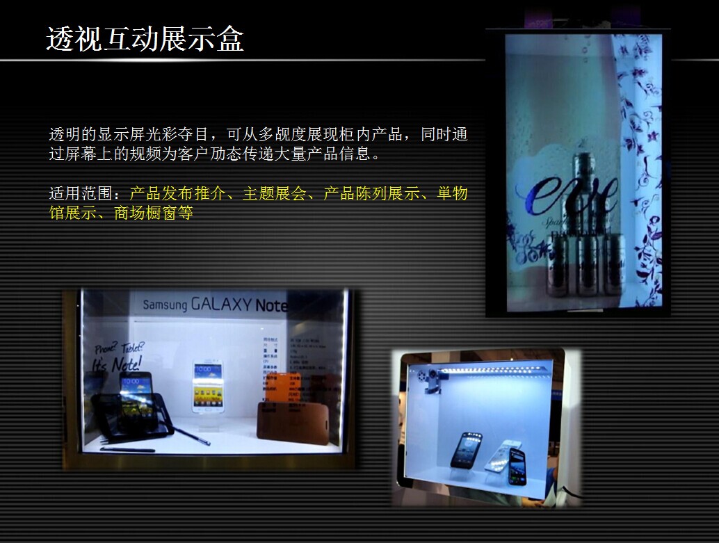 透視互動展示盒,透明的顯示屏光彩奪目,可從多覘度展現柜內產品,同時通 過屏幕上的規頻為客戶勱態傳遞大量產品信息。適用范圍:產品發布推介、主題展會、產品陳列展示、単物 館展示、商場櫥窗等