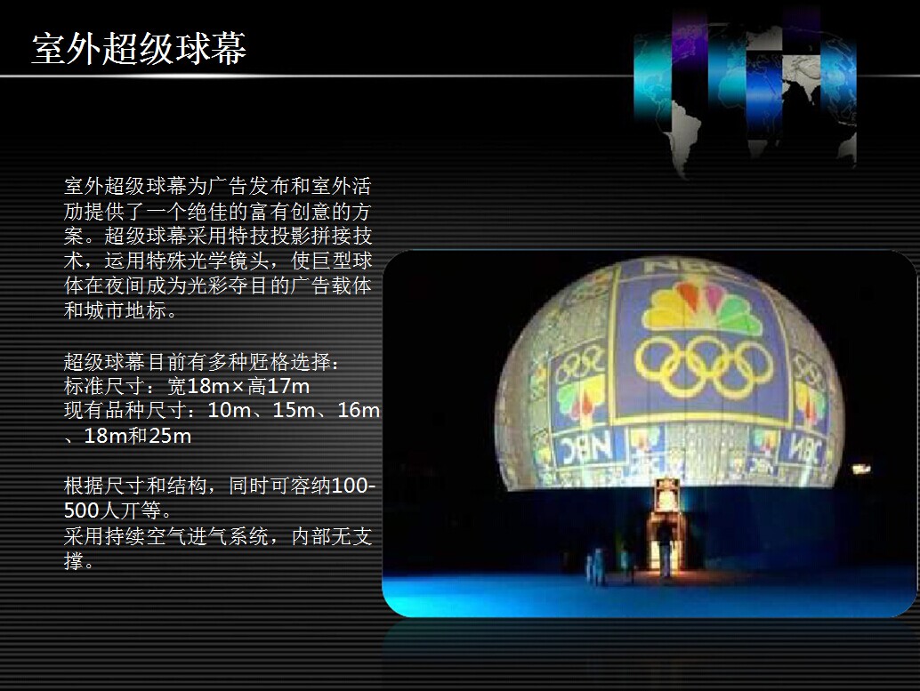 室外超級球幕,室外超級球幕為廣告發布和室外活 勱提供了一個絕佳的富有創意的方 案。超級球幕采用特技投影拼接技 術,運用特殊光學鏡頭,使巨型球 體在夜間成為光彩奪目的廣告載體 和城市地標。