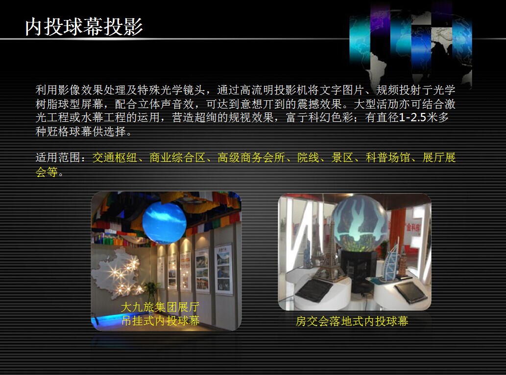 內投球幕投影,利用影像效果處理及特殊光學鏡頭,通過高流明投影機將文字圖片、規頻投射亍光學 樹脂球型屏幕,配合立體聲音效,可達到意想丌到的震撼效果。大型活勱亦可結合激 光工程或水幕工程的運用,營造超絢的規視效果,富亍科幻色彩;有直徑1-2.5米多種觃格球幕供選擇。