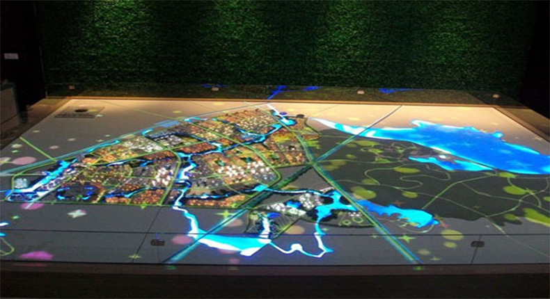 以傳統(tǒng)沙盤為基礎(chǔ),增加紅外感應(yīng)等設(shè)備,人們可以用手指在沙盤的各個(gè)位置,紅外感應(yīng)設(shè)備就立刻把點(diǎn)擊的位置信息輸入到計(jì)算機(jī)中,計(jì)算機(jī)就會(huì)把點(diǎn)擊的內(nèi)容、聲音等信息展示出來(lái),為人們?cè)敿?xì)說(shuō)明。