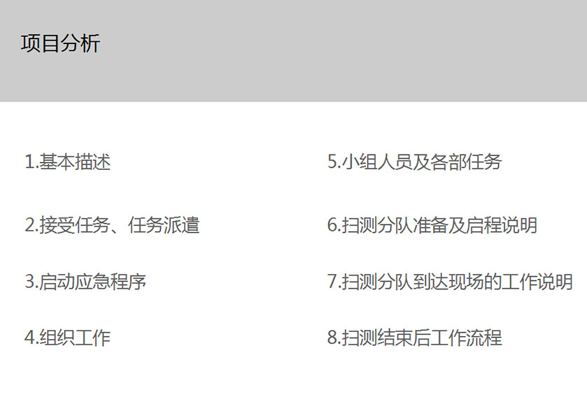 任務內容;應急掃測分隊集結并準備結束后,并立即啟程乘應急搶險車輛前往事發水域。測繪科項目工程師應及時與當地海事管理部門做好測量人員信息、測量船舶信息、測量初步方案等方面的提前溝通,