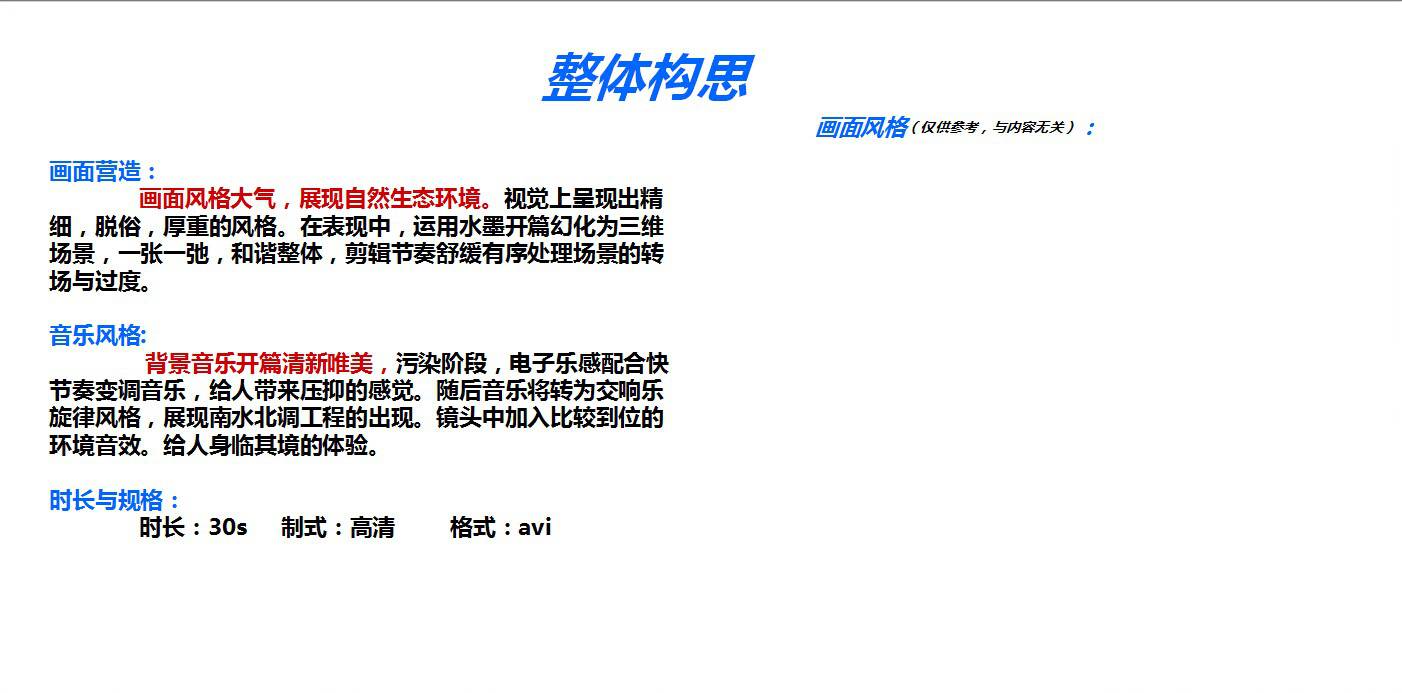 整體構思,畫面風格大氣,展現自然生態環境。視覺上呈現出精細,脫俗,厚重的風格。在表現中,運用水墨開篇幻化為三維場景,一張一弛,和諧整體,剪輯節奏舒緩有序處理場景的轉場與過度。