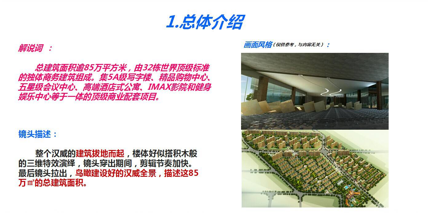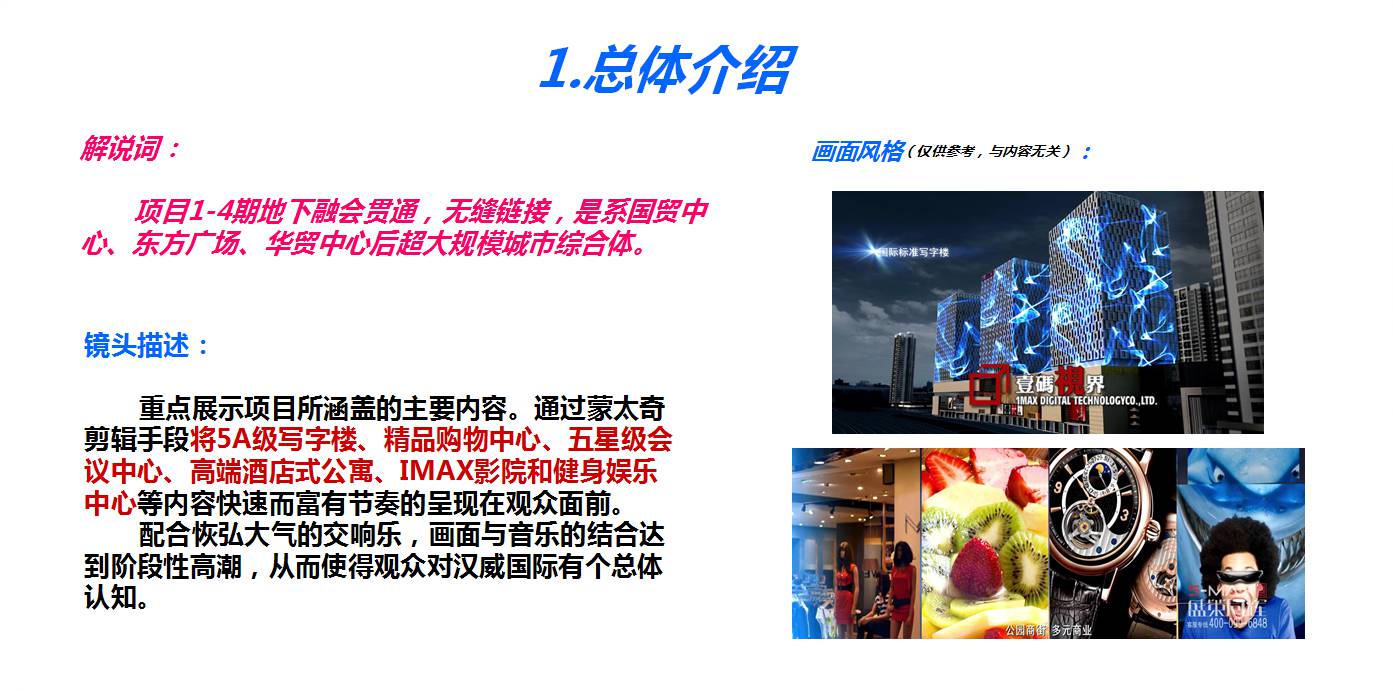 重點展示項目所涵蓋的主要內容。通過蒙太奇剪輯手段將5A級寫字樓、精品購物中心、五星級會議中心、高端酒店式公寓、IMAX影院和健身娛樂中心等內容快速而富有節奏的呈現在觀眾面前。 配合恢弘大氣的交響樂,畫面與音樂的結合達到階段性高潮,從而使得觀眾對漢威國際有個總體認知。