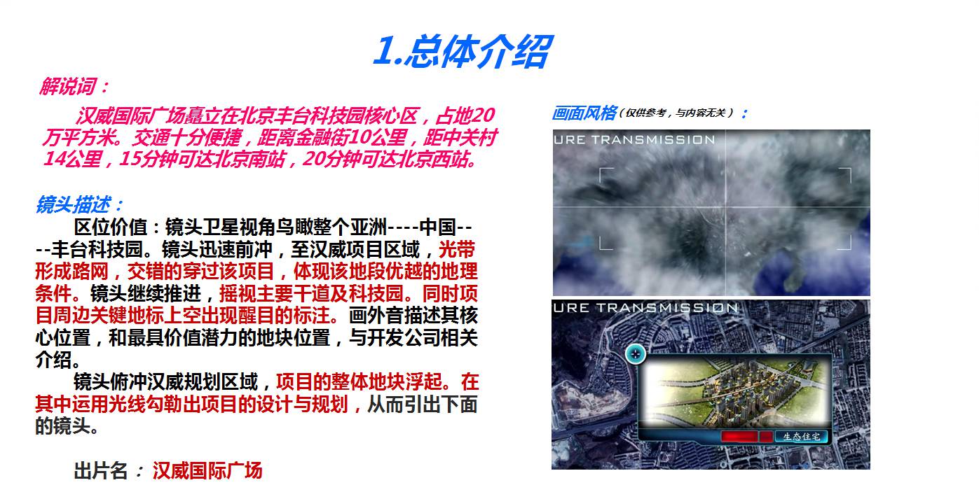 區位價值:鏡頭衛星視角鳥瞰整個亞洲----中國----豐臺科技園。鏡頭迅速前沖,至漢威項目區域,光帶形成路網,交錯的穿過該項目,體現該地段優越的地理條件。鏡頭繼續推進,搖視主要干道及科技園。同時項目周邊關鍵地標上空出現醒目的標注。畫外音描述其核心位置,和最具價值潛力的地塊位置,與開發公司相關介紹。 鏡頭俯沖漢威規劃區域,項目的整體地塊浮起。在其中運用光線勾勒出項目的設計與規劃,從而引出下面的鏡頭。