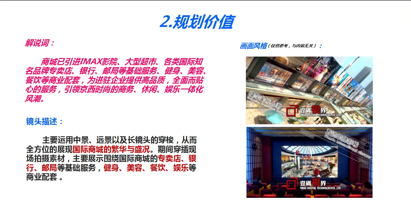 主要運用中景、遠景以及長鏡頭的穿梭,從而全方位的展現國際商城的繁華與盛況。期間穿插現場拍攝素材,主要展示圍繞國際商城的專賣店、銀行、郵局等基礎服務,健身、美容、餐飲、娛樂等商業配套