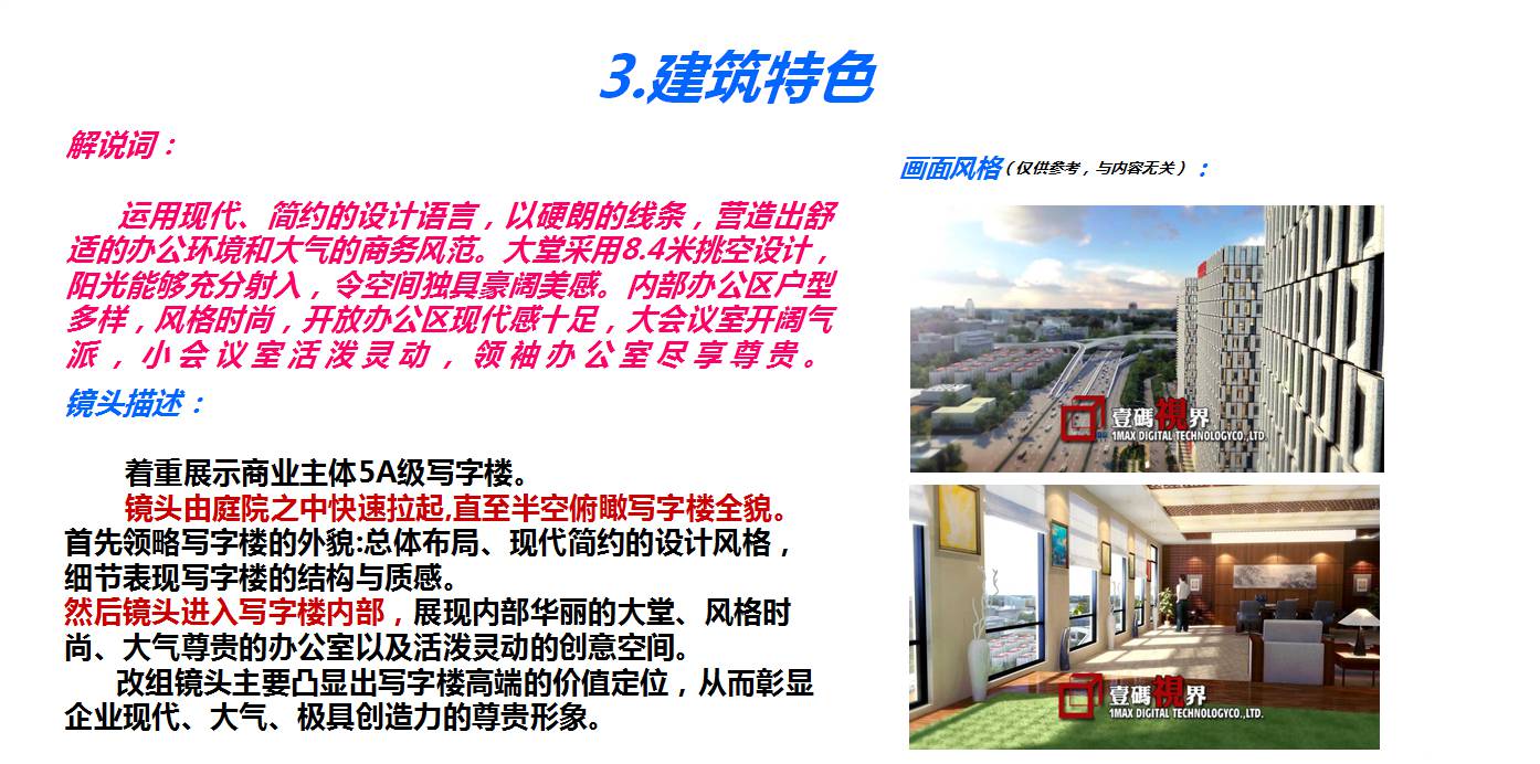 著重展示商業主體5A級寫字樓。 鏡頭由庭院之中快速拉起,直至半空俯瞰寫字樓全貌。首先領略寫字樓的外貌:總體布局、現代簡約的設計風格,細節表現寫字樓的結構與質感。 然后鏡頭進入寫字樓內部,展現內部華麗的大堂、風格時尚、大氣尊貴的辦公室以及活潑靈動的創意空間。 改組鏡頭主要凸顯出寫字樓高端的價值定位,從而彰顯企業現代、大氣、極具創造力的尊貴形象。