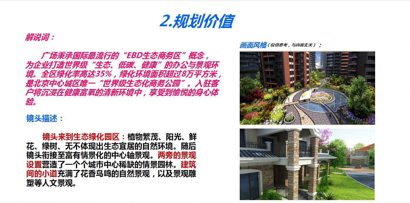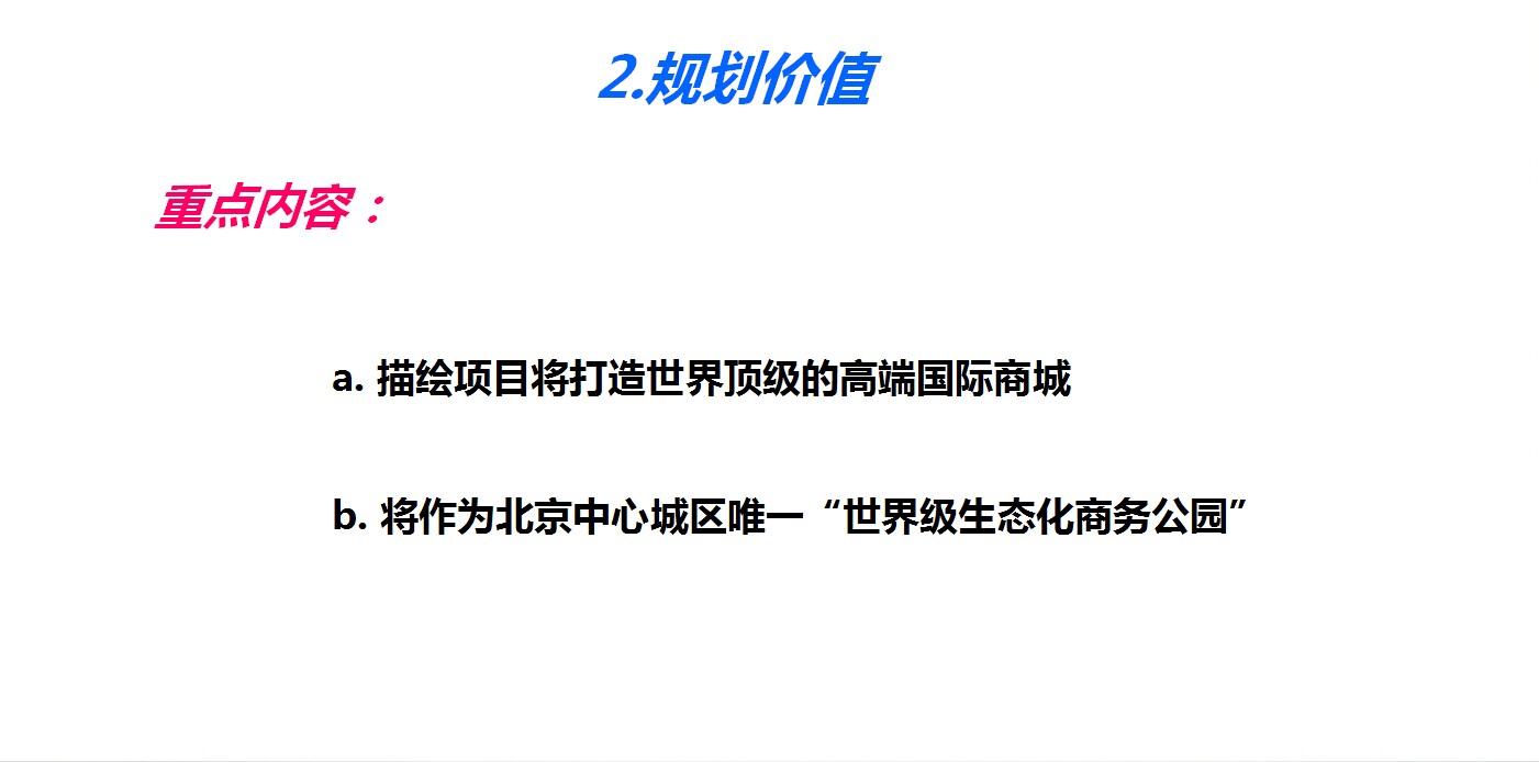 規劃價值,描繪項目將打造世界頂級的高端國際商城,將作為北京中心城區唯一“世界級生態化商務公園”