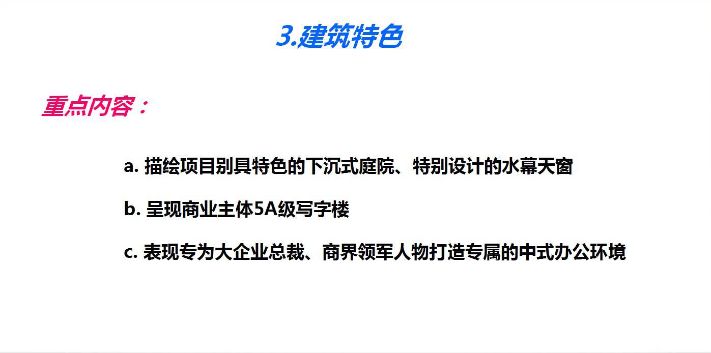 建筑特色,描繪項目別具特色的下沉式庭院、特別設計的水幕天窗,呈現商業主體5A級寫字樓,表現專為大企業總裁、商界領軍人物打造專屬的中式辦公環境。