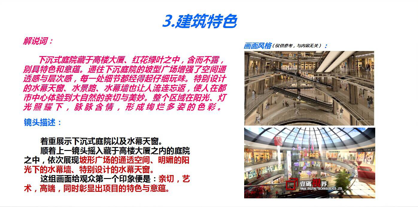 著重展示下沉式庭院以及水幕天窗。 順著上一鏡頭搖入藏于高樓大廈之內的庭院之中,依次展現坡形廣場的通透空間、明媚的陽光下的水幕墻、特別設計的水幕天窗。 這組畫面給觀眾第一個印象便是:親切,藝術,高端,同時彰顯出項目的特色與意蘊。