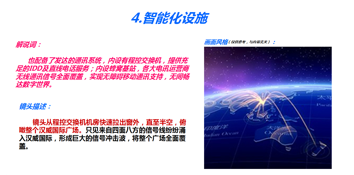 智能化設施,描述樓梯間均采用安全華麗的日本原裝三菱高速電梯,呈現室內采用的國際領先的智能空調系統,表現園區中配備了發達的通訊系統,實現無間暢達數字世界