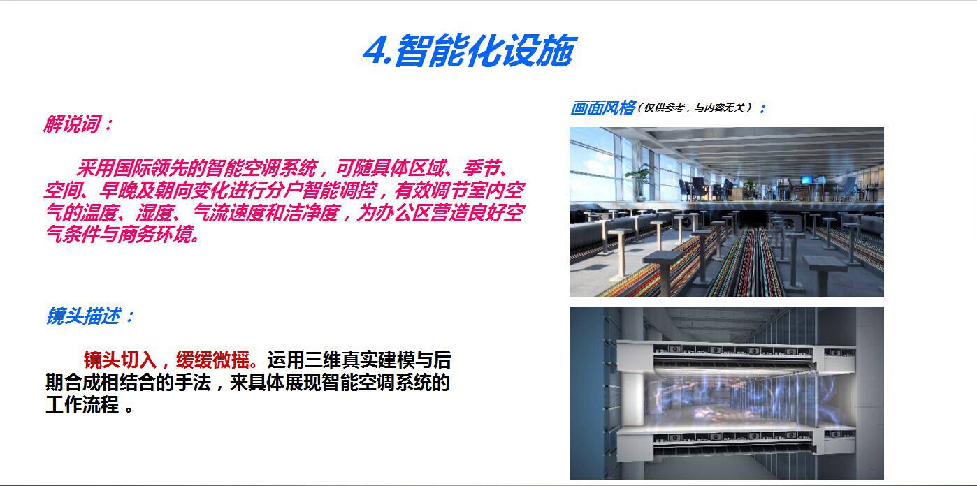 鏡頭切入,緩緩微搖。運用三維真實建模與后期合成相結合的手法,來具體展現智能空調系統的工作流程 。