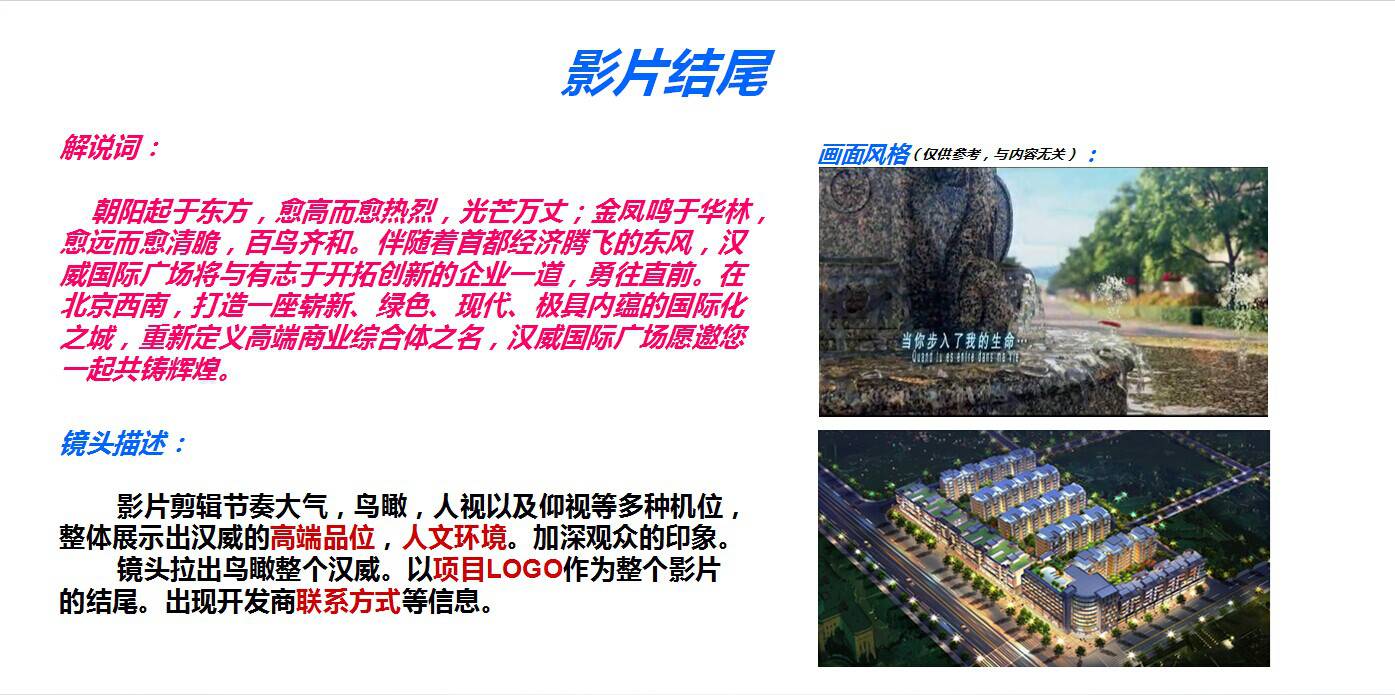 影片結尾,影片剪輯節奏大氣,鳥瞰,人視以及仰視等多種機位,整體展示出漢威的高端品位,人文環境。加深觀眾的印象。 鏡頭拉出鳥瞰整個漢威。以項目LOGO作為整個影片的結尾。出現開發商聯系方式等信息。