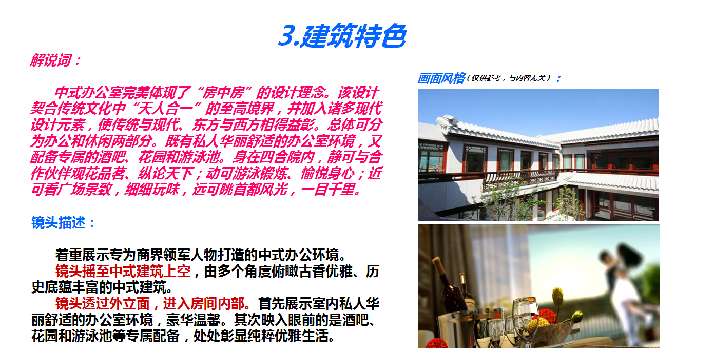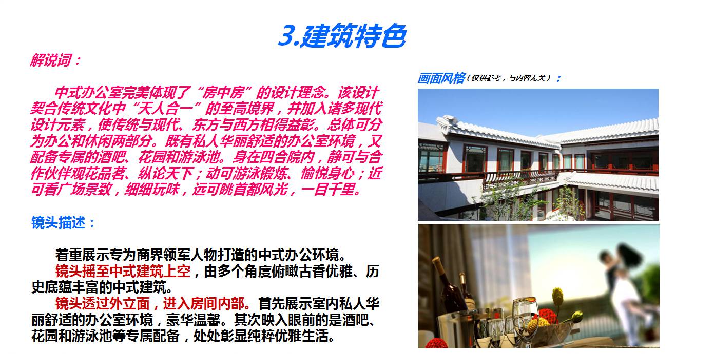 著重展示專為商界領軍人物打造的中式辦公環境。 鏡頭搖至中式建筑上空,由多個角度俯瞰古香優雅、歷史底蘊豐富的中式建筑。 鏡頭透過外立面,進入房間內部。首先展示室內私人華麗舒適的辦公室環境,豪華溫馨。其次映入眼前的是酒吧、花園和游泳池等專屬配備,處處彰顯純粹優雅生活。