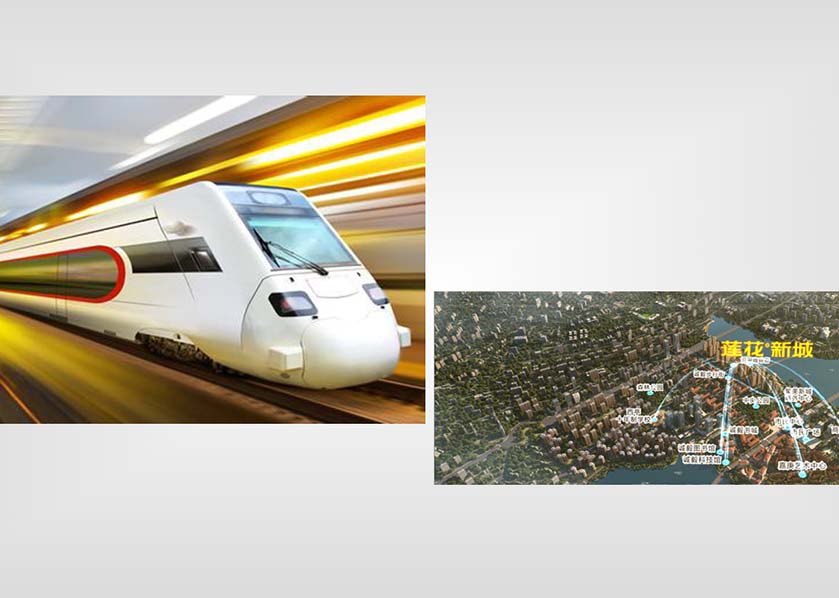 女主人乘坐高鐵,畫面切出地圖全景,以項目為中心介紹項目陸、空交通 -