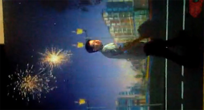 這是互動投影一次全新的展示,以前互動投影展示的是某一畫面、某一平面、某一物體,而今天展示的是一座城市街道的熱鬧情景,并在這虛擬情景中能與人進行互動。從視頻中可以看出,互動投影展示的有街道、車、樹木、房屋、建筑等等,仿佛跟真的一樣,車在人們的腳下形式,煙花隨著人手的擺動而大放光彩,把鬧市景象全部模擬出來,盡在人們眼前。