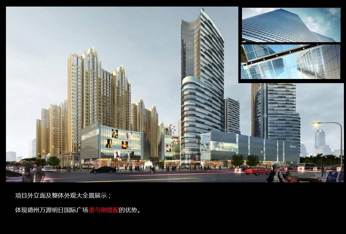項目外立面及整體外觀大全景展示; 體現德州萬源明日國際廣場柔與剛搭配的優勢。