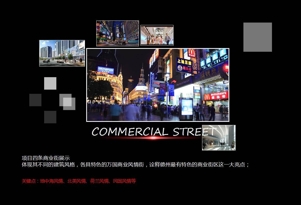 項目四條商業街展示 體現其不同的建筑風格,各具特色的萬國商業風情街,詮釋德州最有特色的商業街區這一大亮點;