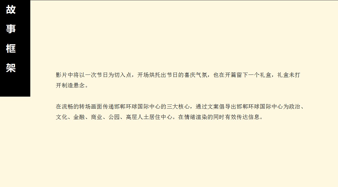故事框架,影片中將以一次節日為切入點,開場烘托出節日的喜慶氣氛,也在開篇留下一個禮盒,禮盒未打開制造懸念。在流暢的轉場畫面傳遞邯鄲環球國際中心的三大核心,通過文案倡導出邯鄲環球國際中心為政治、文化、金融、商業、公園、高層人土居住中心。在情緒渲染的同時有效傳達信息。