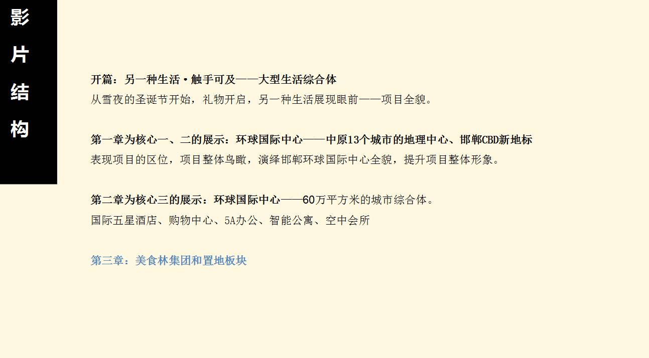 影片結構,開篇:另一種生活·觸手可及——大型生活綜合體 從雪夜的圣誕節開始,禮物開啟,另一種生活展現眼前——項目全貌。
