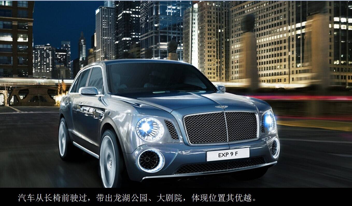 汽車從長椅前駛過,帶出龍湖公園、大劇院,體現位置其優越