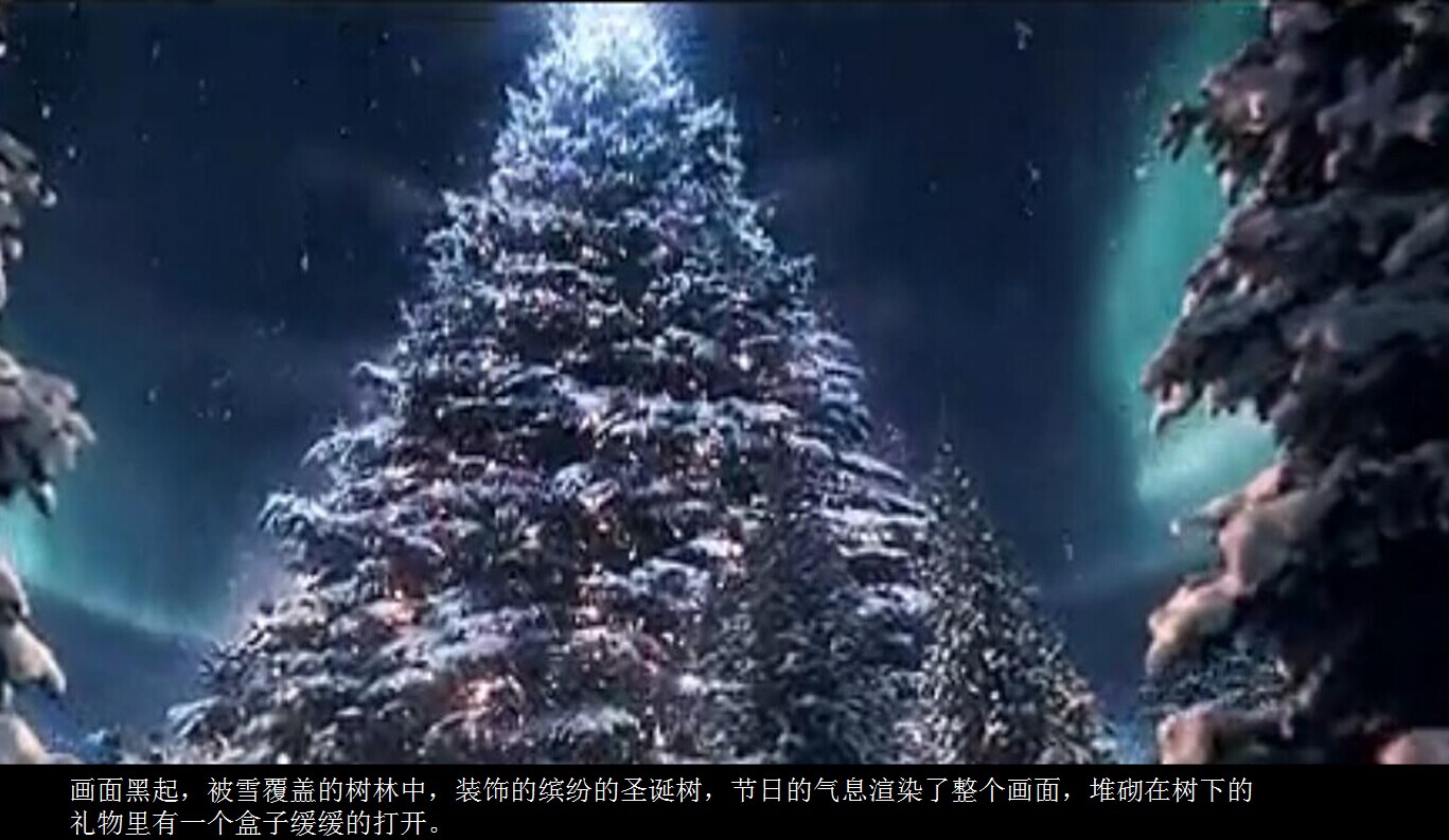畫面黑起,被雪覆蓋的樹林中,裝飾的繽紛的圣誕樹,節日的氣息渲染了整個畫面,堆砌在樹下的 禮物里有一個盒子緩緩的打開。
