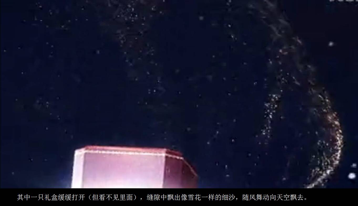其中一只禮盒緩緩打開(但看不見里面),縫隙中飄出像雪花一樣的細沙,隨風舞動向天空飄去。