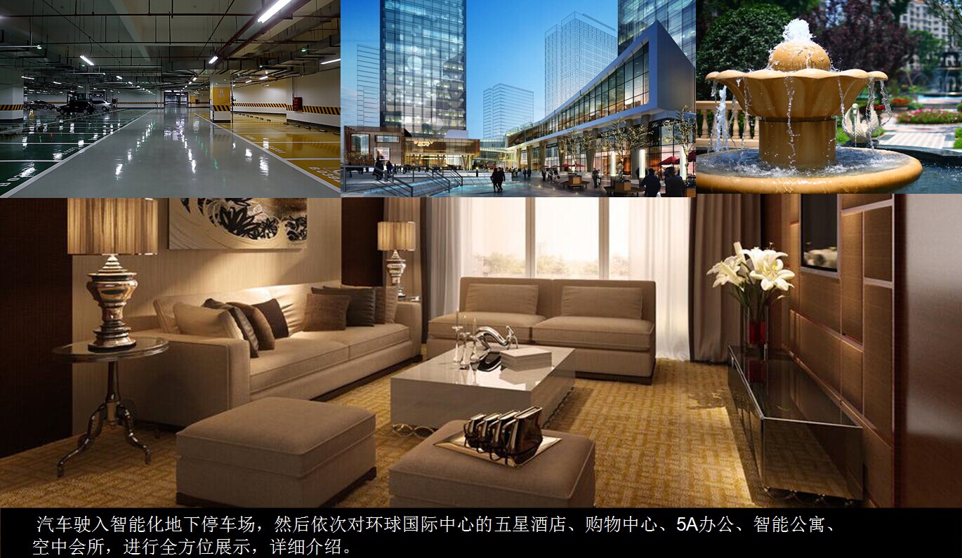 汽車駛入智能化地下停車場,然后依次對環球國際中心的五星酒店、購物中心、5A辦公、智能公寓、 空中會所,進行全方位展示,詳細介紹。