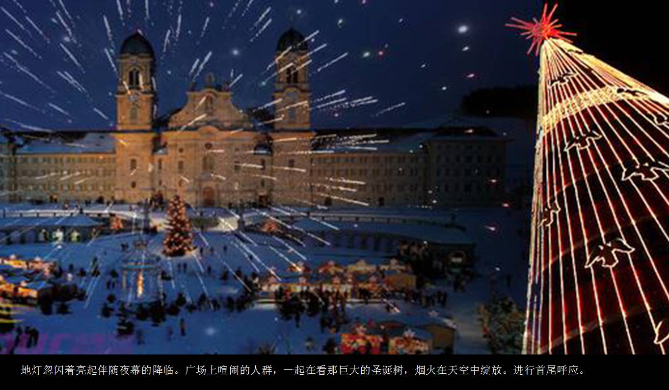 地燈忽閃著亮起伴隨夜幕的降臨。廣場上喧鬧的人群,一起在看那巨大的圣誕樹,煙火在天空中綻放。進行首尾呼應。
