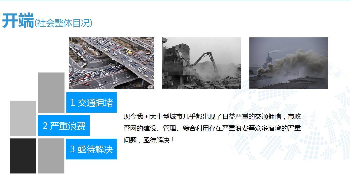 開端(社會整體目況),現(xiàn)今我國大中型城市幾乎都出現(xiàn)了日益嚴(yán)重的交通擁堵,市政管網(wǎng)的建設(shè)、管理、綜合利用存在嚴(yán)重浪費(fèi)等眾多潛藏的嚴(yán)重問題,亟待解決!