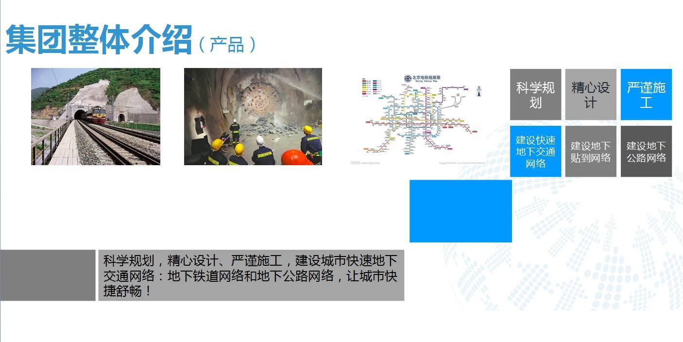 集團(tuán)整體介紹(產(chǎn)品),科學(xué)規(guī)劃,精心設(shè)計、嚴(yán)謹(jǐn)施工,建設(shè)城市快速地下交通網(wǎng)絡(luò):地下鐵道網(wǎng)絡(luò)和地下公路網(wǎng)絡(luò),讓城市快捷舒暢!