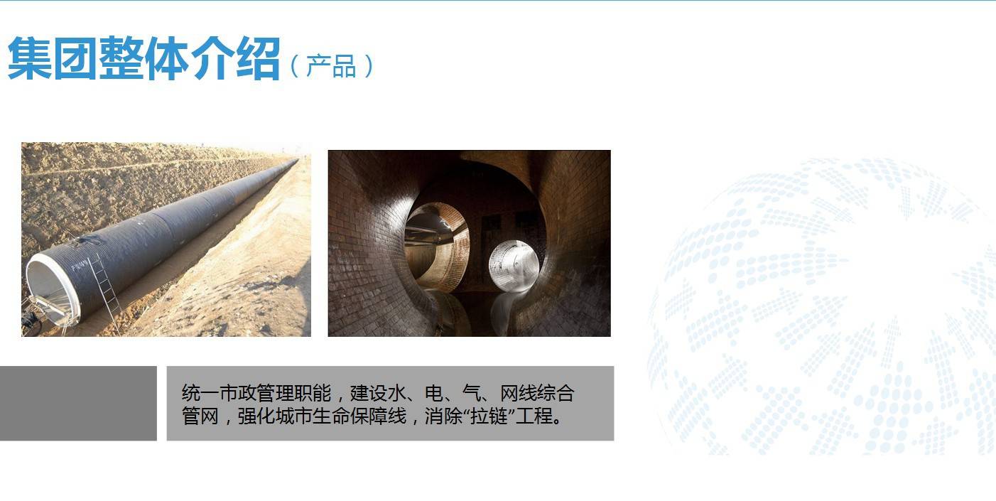 集團(tuán)整體介紹(產(chǎn)品),統(tǒng)一市政管理職能,建設(shè)水、電、氣、網(wǎng)線綜合管網(wǎng),強(qiáng)化城市生命保障線,消除“拉鏈”工程。