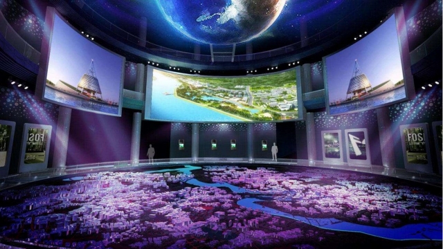 2、 利用大屏幕無縫拼接融合技術,環繞實體沙盤及沙盤天花區域拼接成大型連體幕,利用高保真音響及大視野精彩視頻,給參觀者帶來極大的沉浸感與視覺沖擊力。