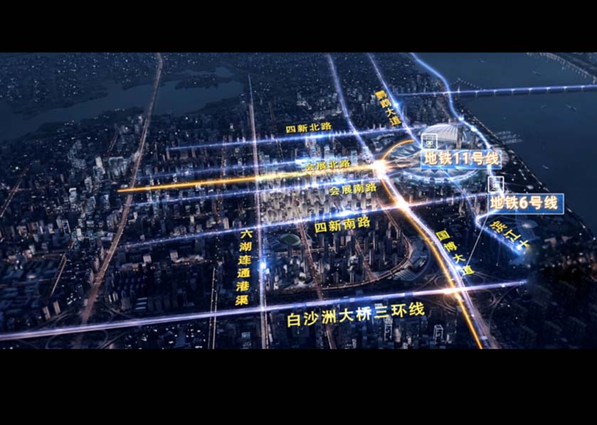 展示園區(qū)夜景大鳥瞰,燈光閃爍,輝煌大氣