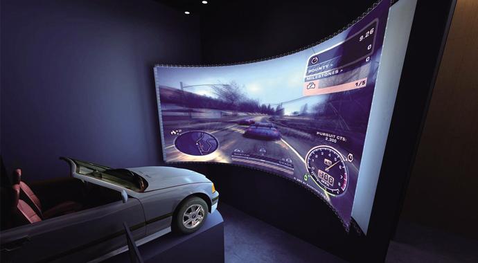 三維圖像即時生成技術、汽車動力學仿真物理系統、大視野顯示技術(如多通道立體投影系統)、六自由度運動平臺(或三自由度運動平臺)、用戶輸入硬件系統、立體聲音響、中控系統等。
